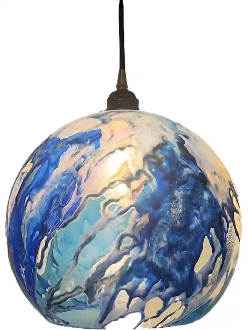 Son globe unique, en verre peint* à la main, révèle un travail artisanal minutieux. Il dialogue avec un pavillon bi-matière pensé comme un écrin, en parfaite résonance avec la sphère.