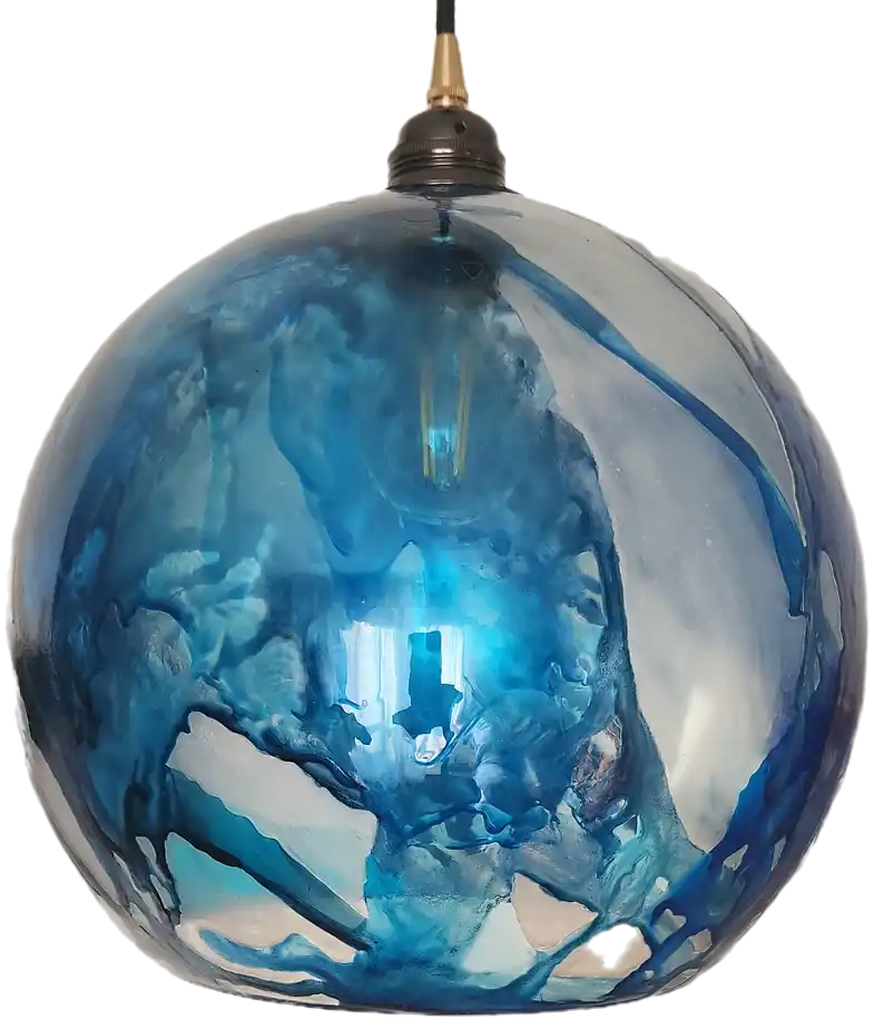 Son globe unique, en verre peint* à la main, révèle un travail artisanal minutieux. Il dialogue avec un pavillon bi-matière pensé comme un écrin, en parfaite résonance avec la sphère.