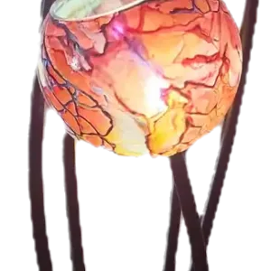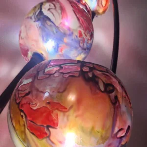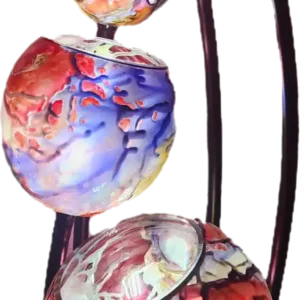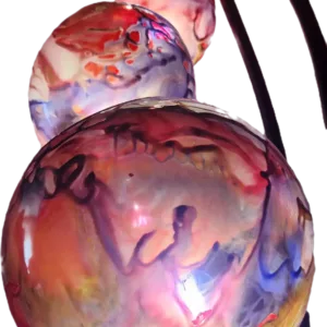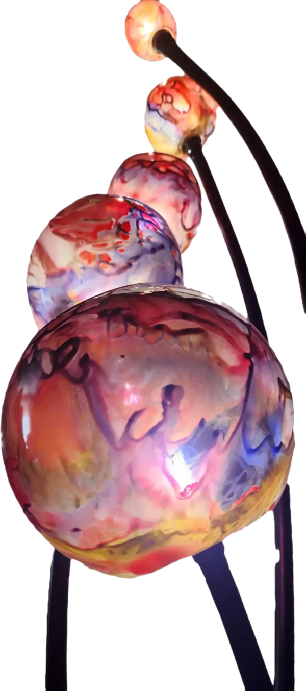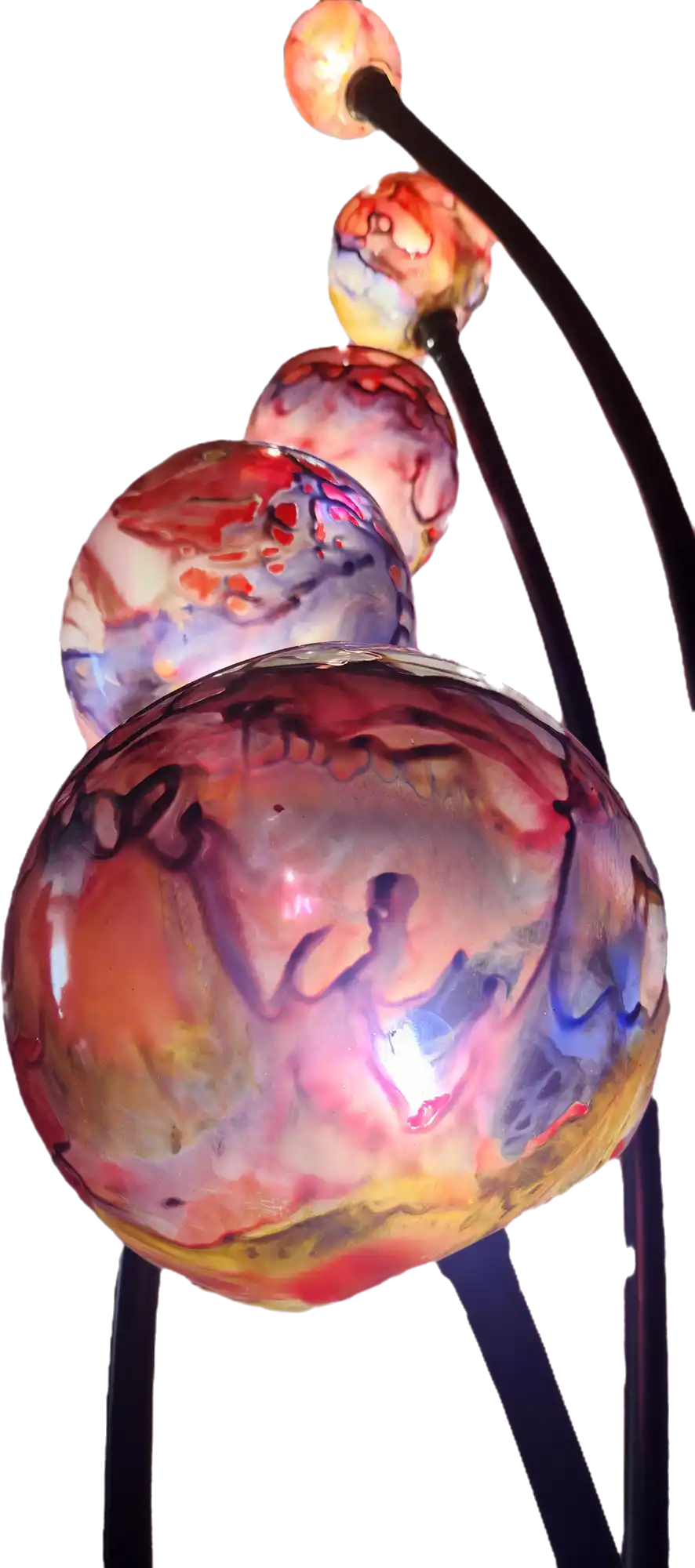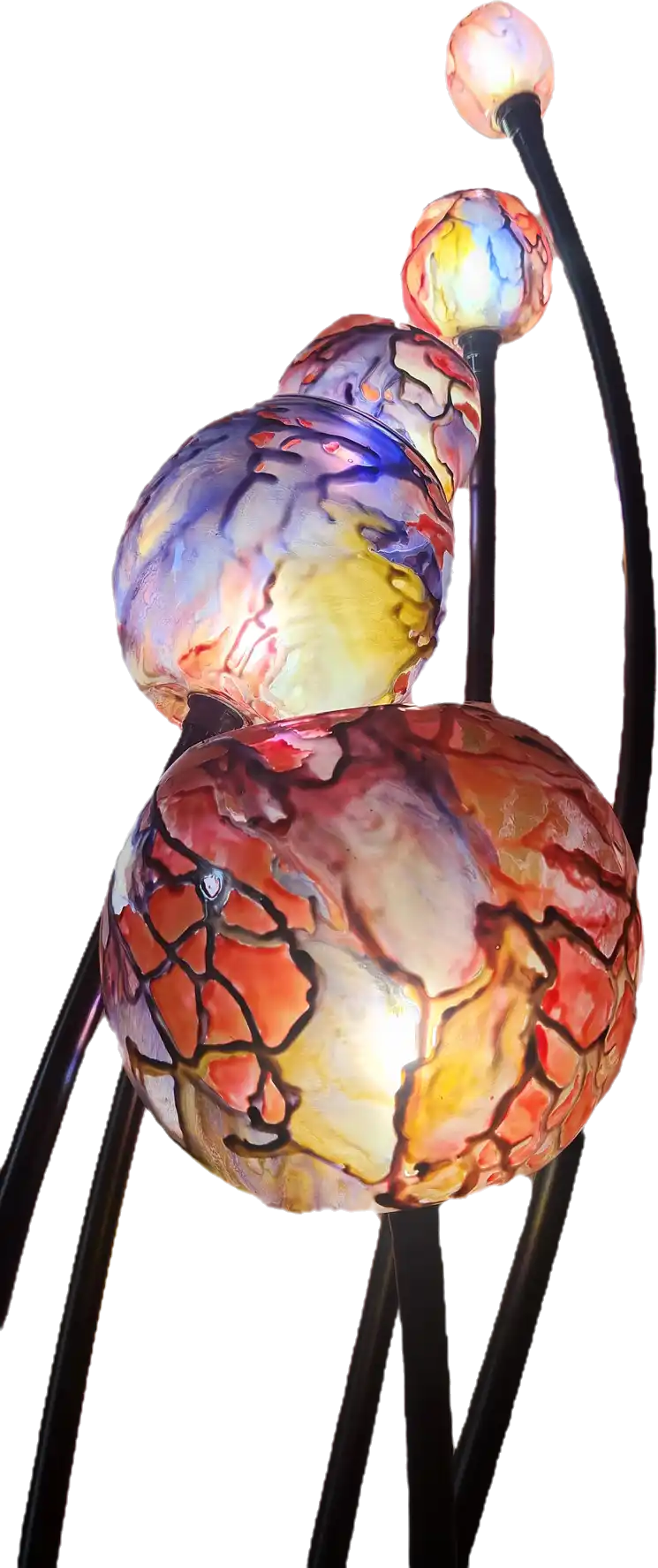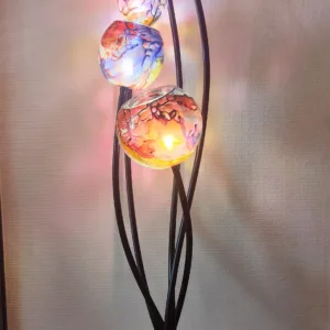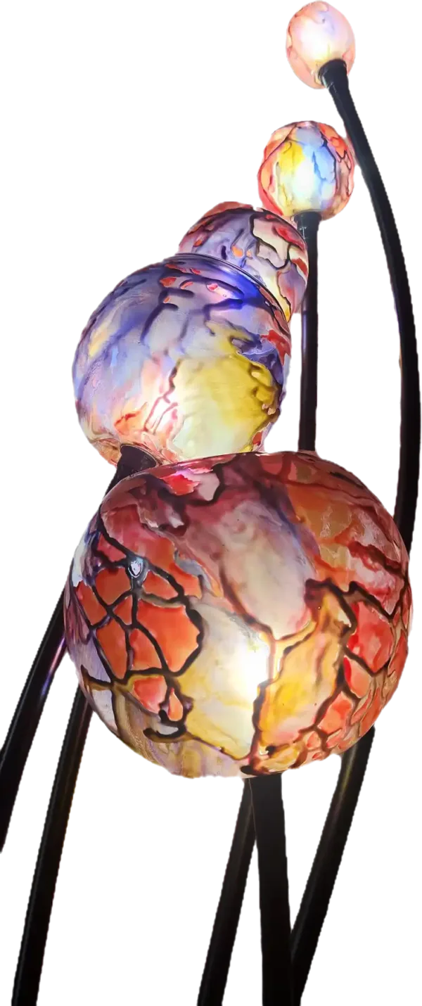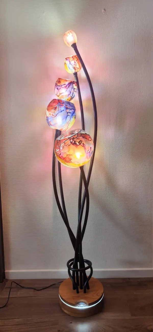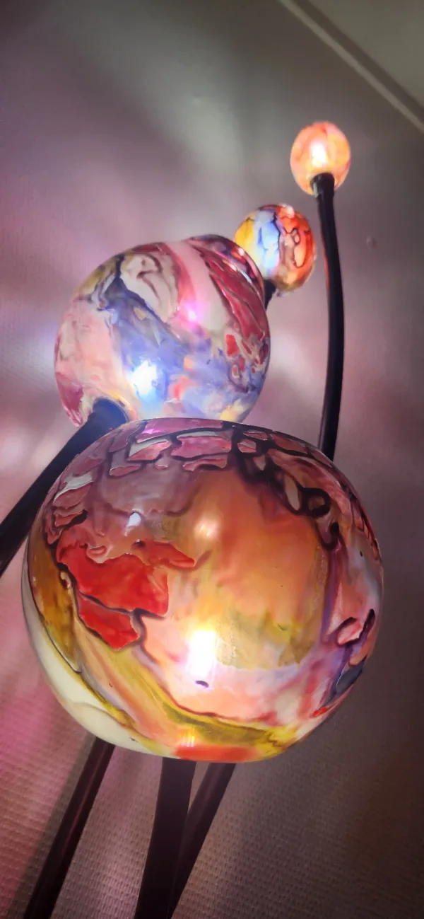 Matériaux: Globes en verre. Socle en bois massif dense et structuré avec liseré lumineux en verre acrylique. Tiges en aluminium, polyéthylène haute densité.