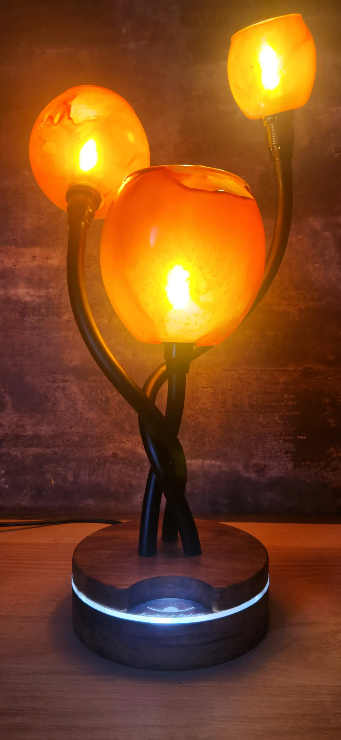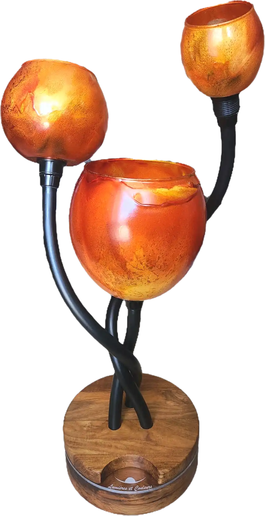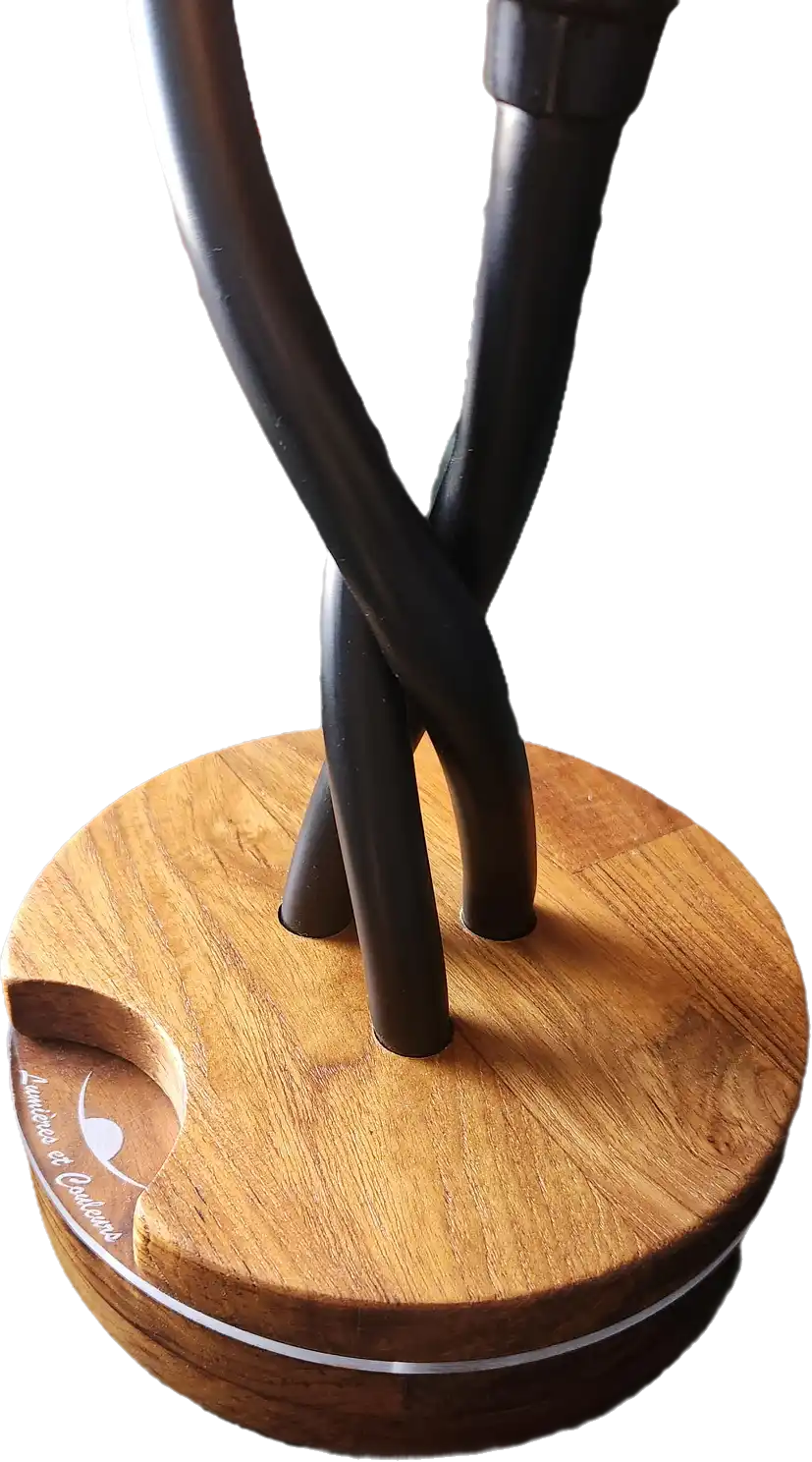 Matériaux: Globes en verre. Socle : Teck massif , liseré lumineux en verre acrylique.
