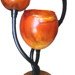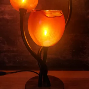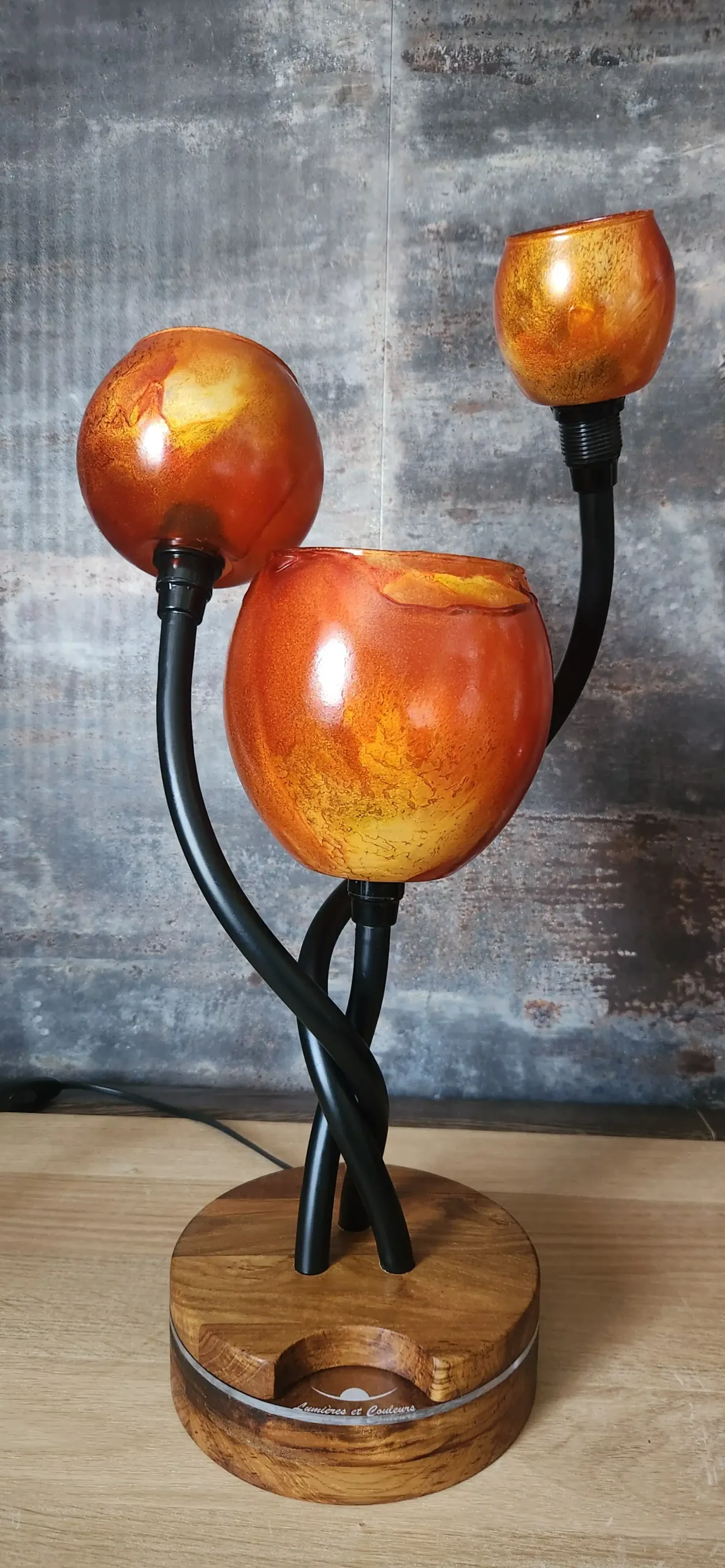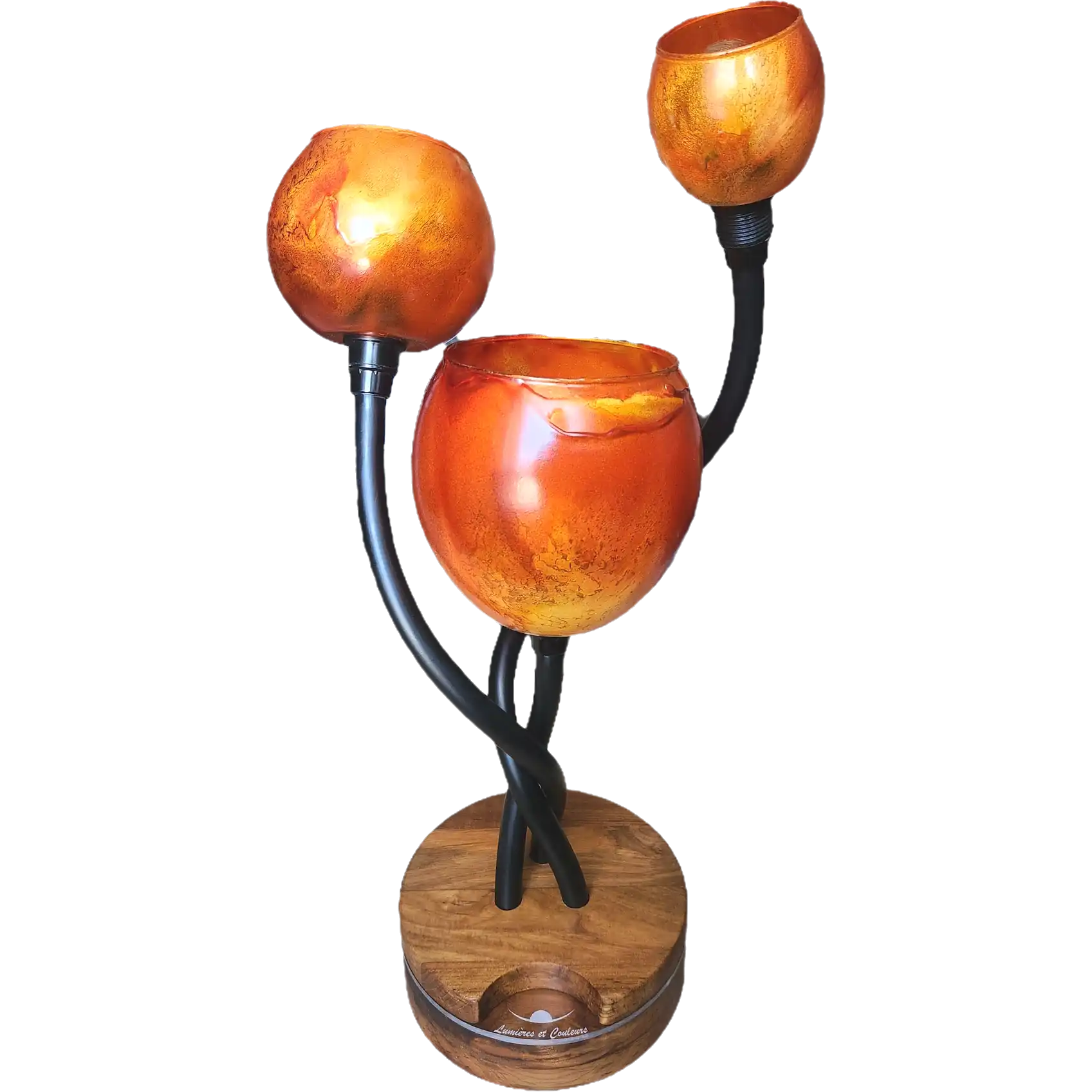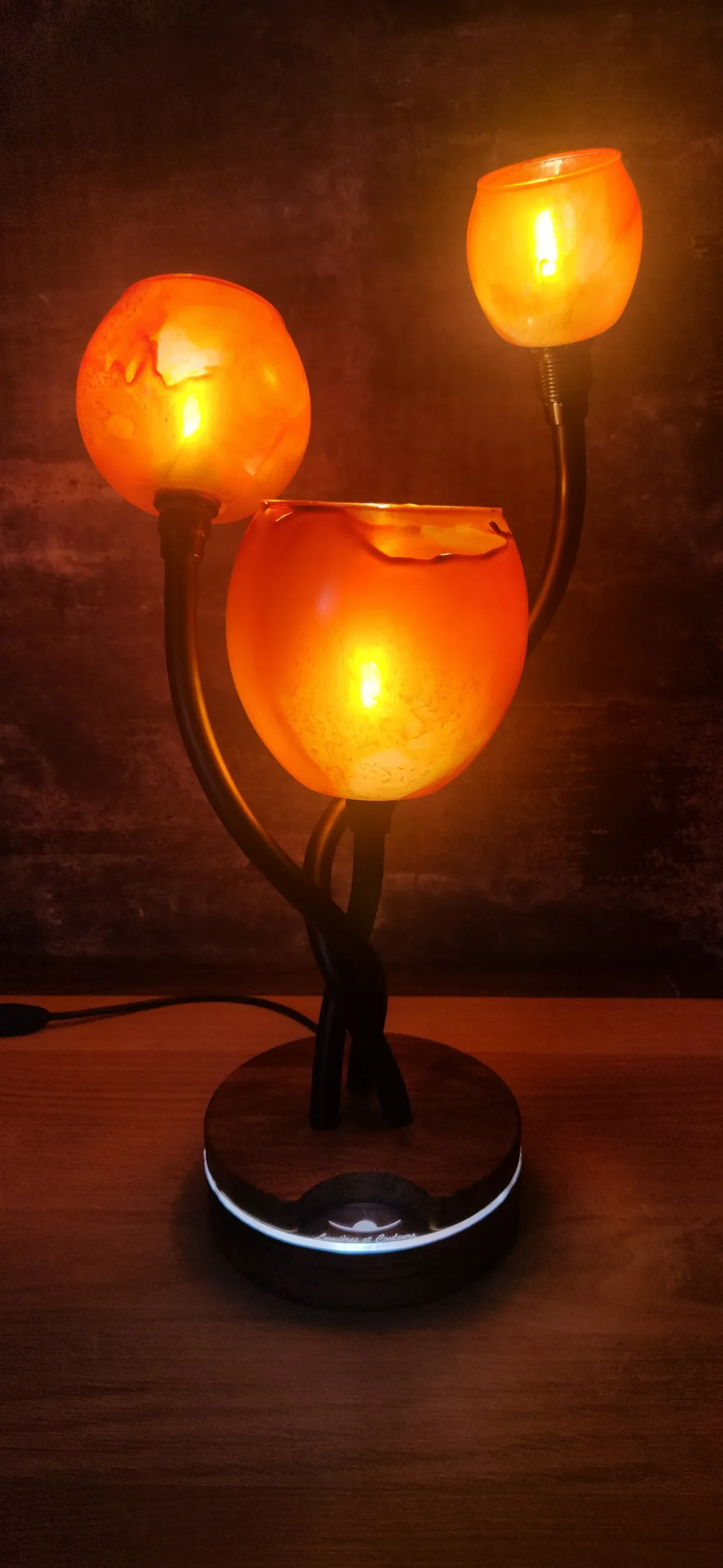 Matériaux: Globes en verre. Socle : Teck massif , liseré lumineux en verre acrylique.